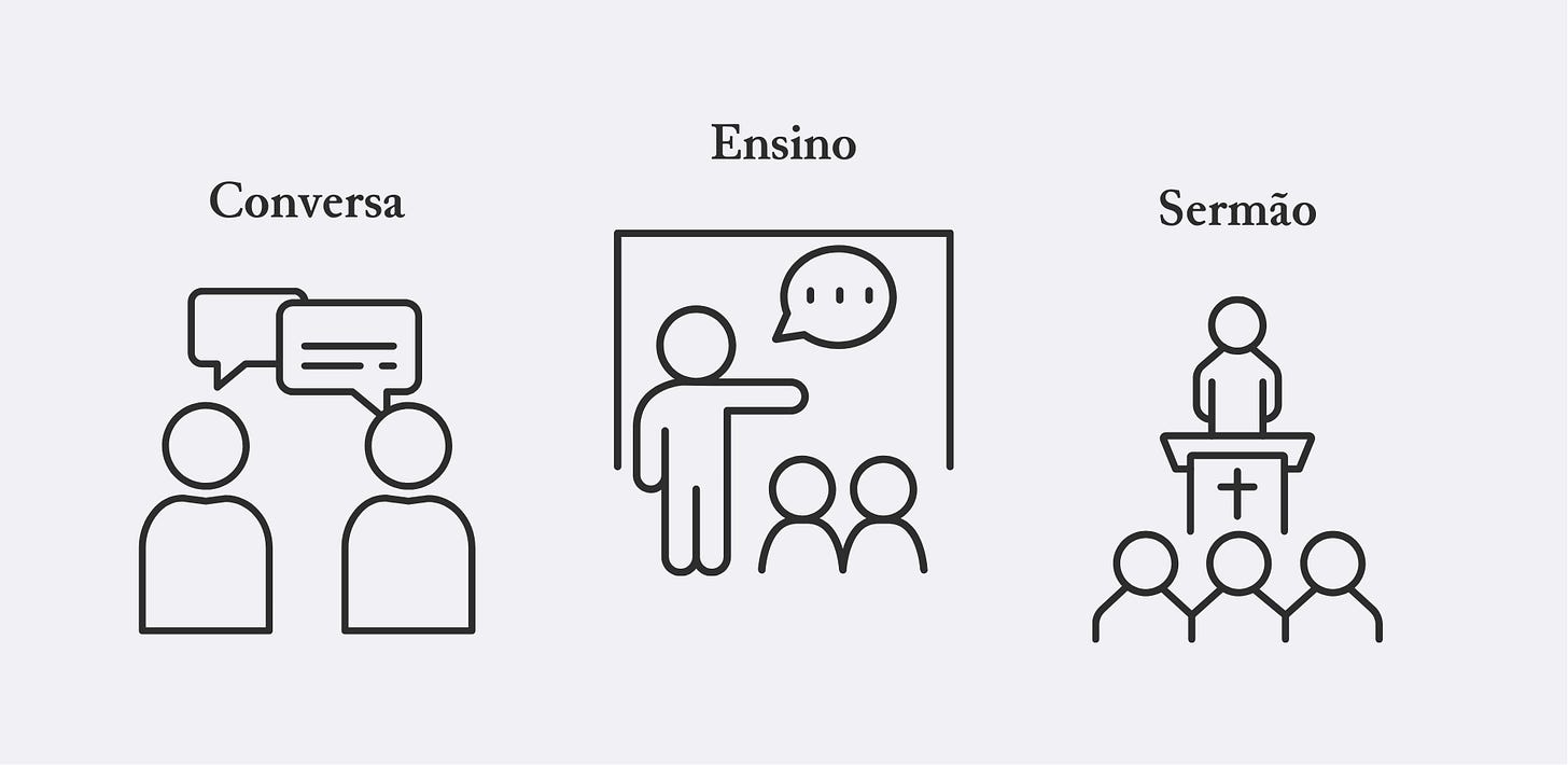 A pregação como forma de conversa é o modo mais básico e comum do cristão transmitir as Escrituras: durante um diálogo, apresenta-se a Palavra de Deus visando explicar a fé. Isso ocorre em diferentes contextos, mas geralmente não há um esquema prévio para a conclusão do diálogo, no qual o conhecimento bíblico e teológico será de fundamental importância para apresentar o Evangelho diante de temas e questionamentos que possam surgir.